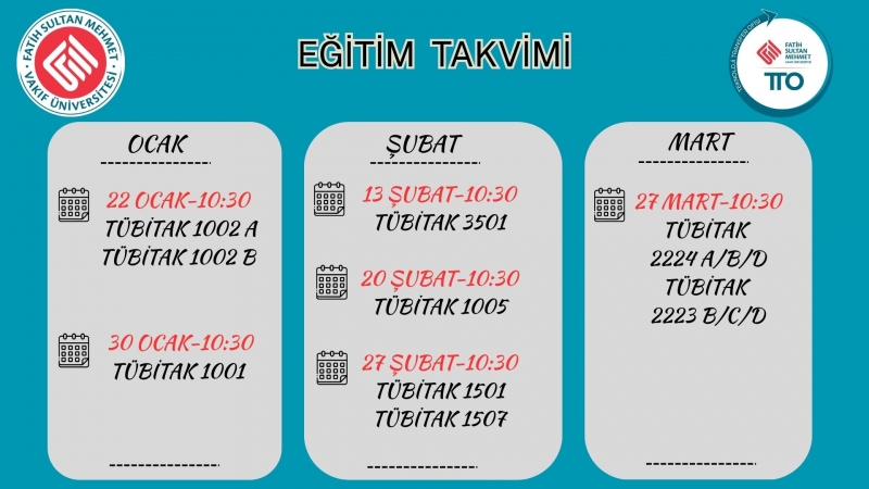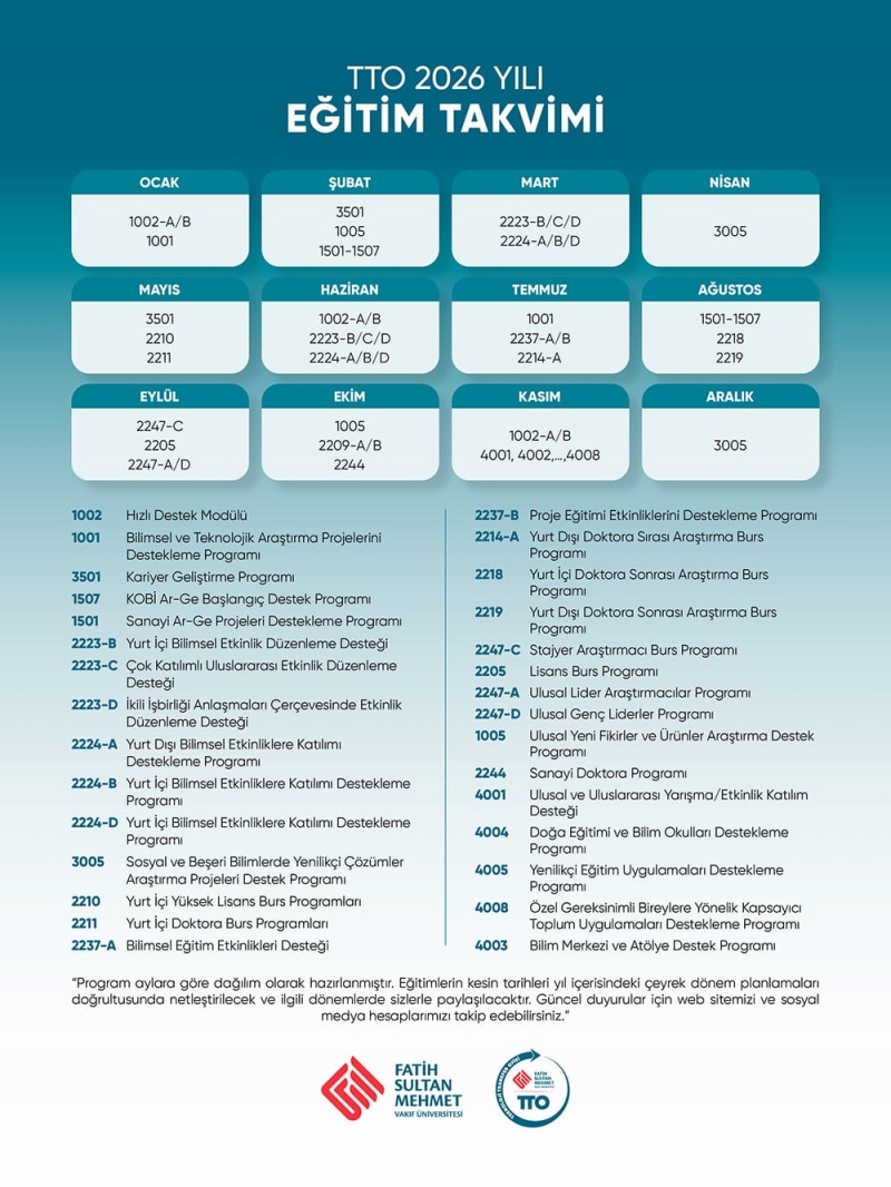 TTO tarafından hazırlanan 2026 Yılı Eğitim Takvimi ile yıl boyunca proje süreçlerinizde yanınızdayız. TÜBİTAK destek programlarına yönelik proje yazma eğitimlerimizi, başvuru dönemlerini dikkate alarak planladık.Eğitim programımız yılın çeyreklerine göre paylaşılacaktır.
